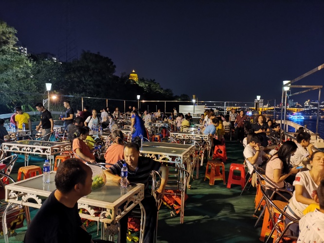 上的船是三层,大家都不约而同到顶层露天,方便观景。中秋过后夜间凉风阵阵,这样边赏夜景边喝茶吃点心的感觉是挺好的。可惜这次大家都比较赶的样子,没有闲情坐着慢聊。