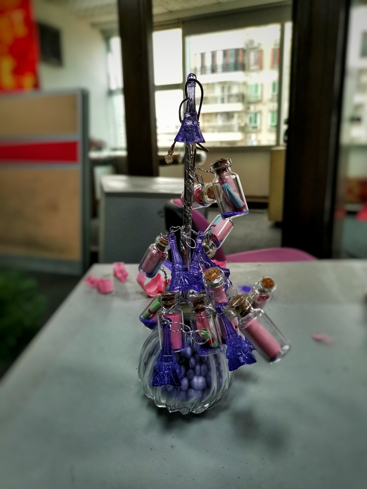 因为缺少八卦,拆了几个之后大伙也都失去了兴趣,把剩余的许愿瓶晾在了一边,我想着它的使命已经完成,应该不会再跟我们到新的职场,我便拍下了这张照片留念。