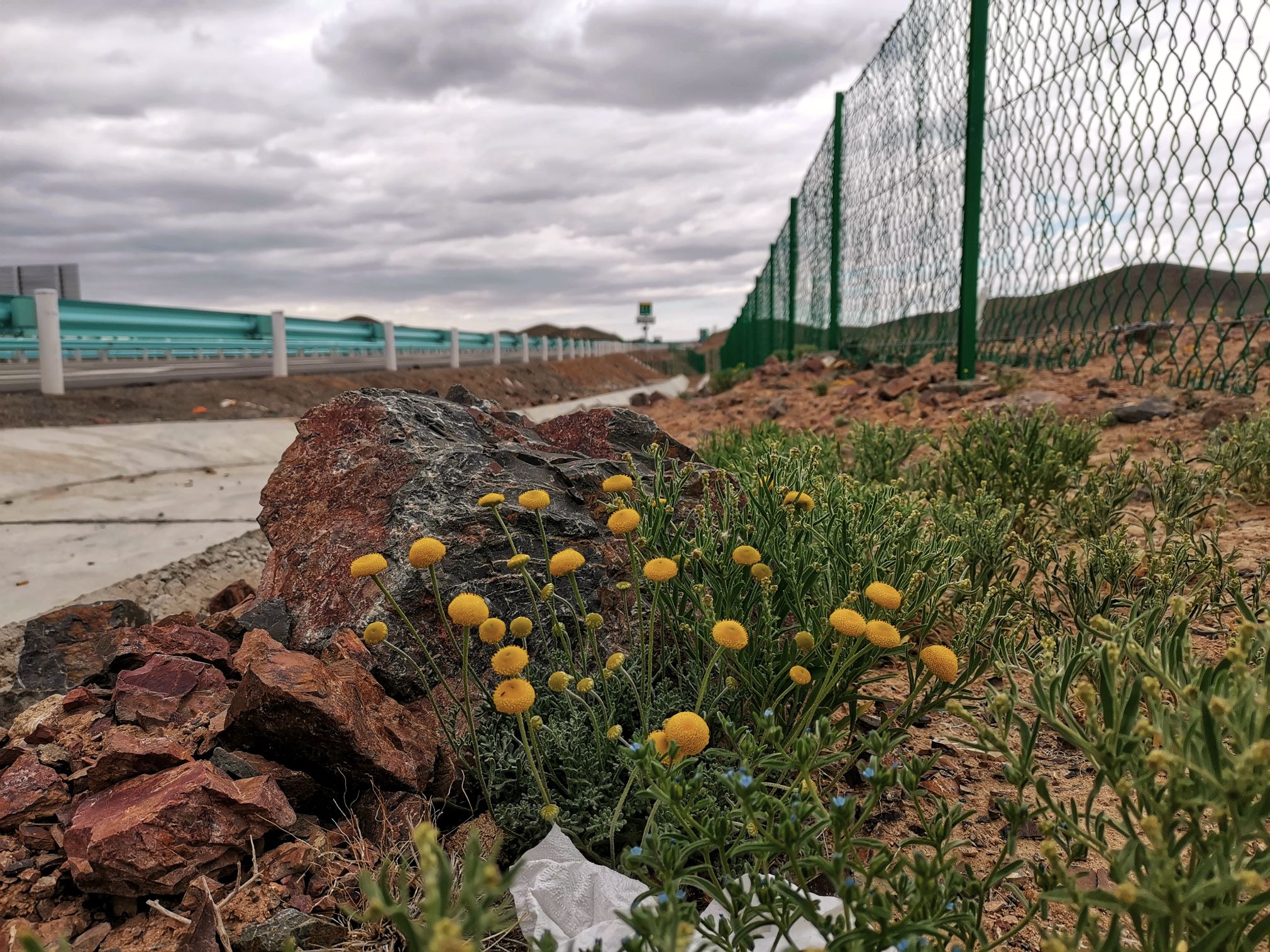中途被迫停车(车辆有每4小时强制休息的装置)前不着村后不着店,又没信号,下车看到路边的野菊花……