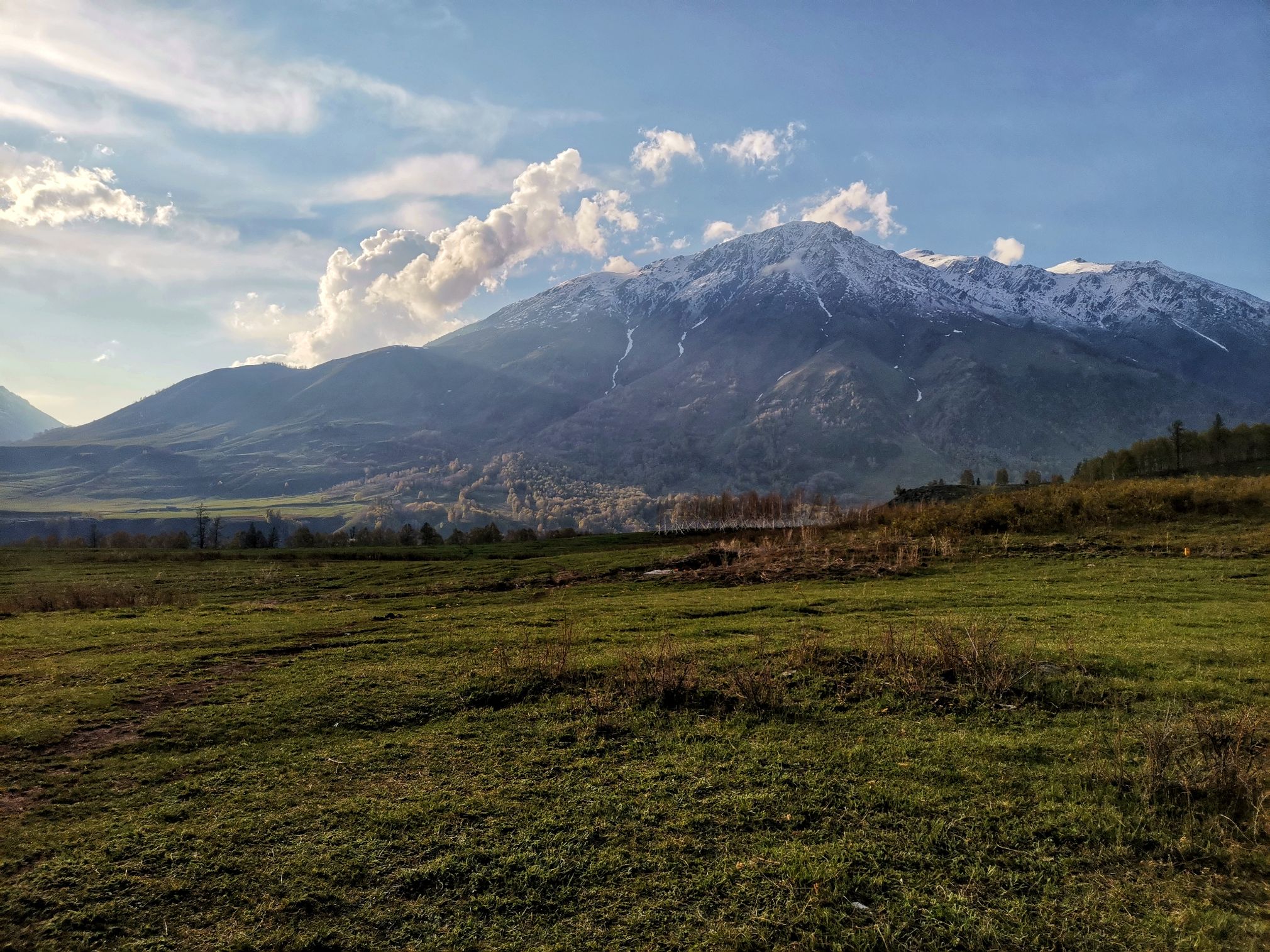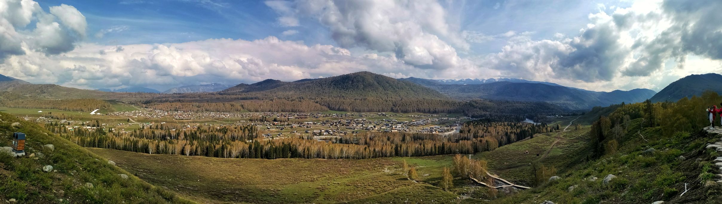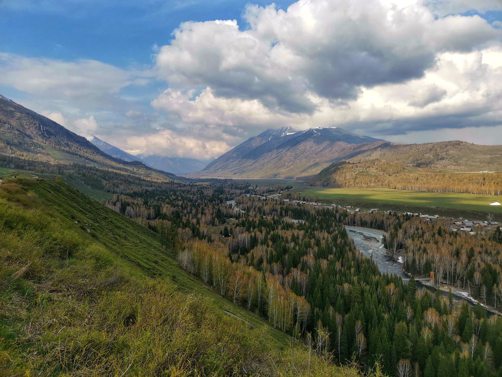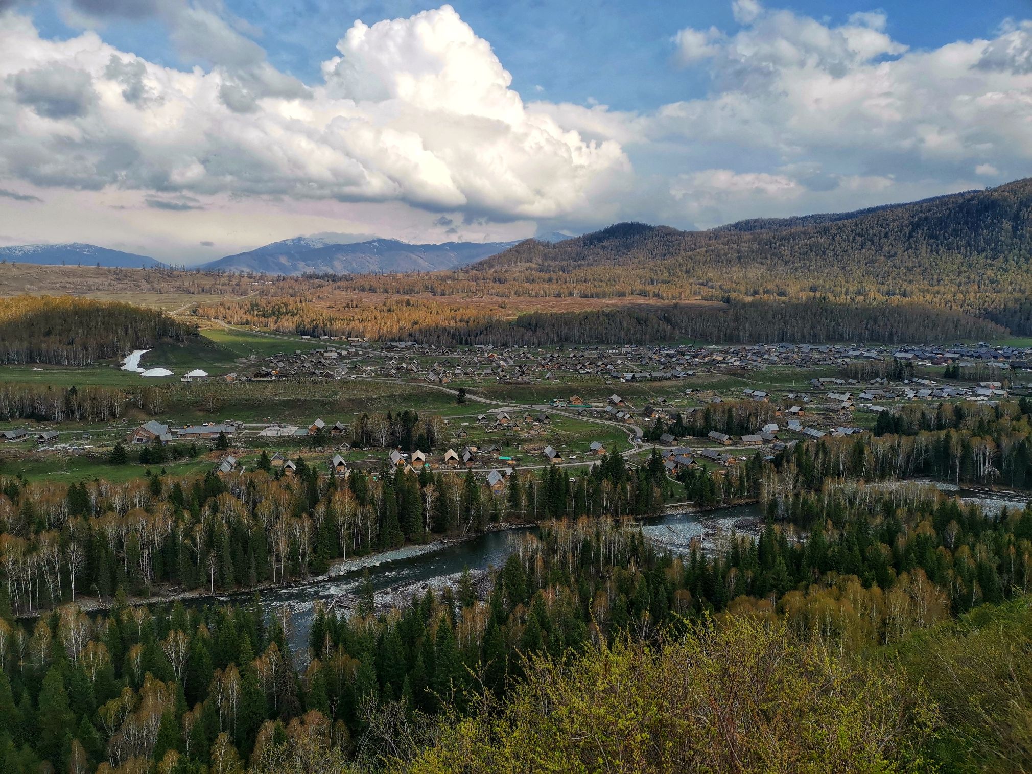 去禾木漫长的旅途中间,车子路过大山下降的中途,我们有幸看到了雪景,还看到了非常广阔的大山谷中,云雾袅绕下,成片松林与桦树林各色交织,这些给大伙漫长车旅途增添了美景。