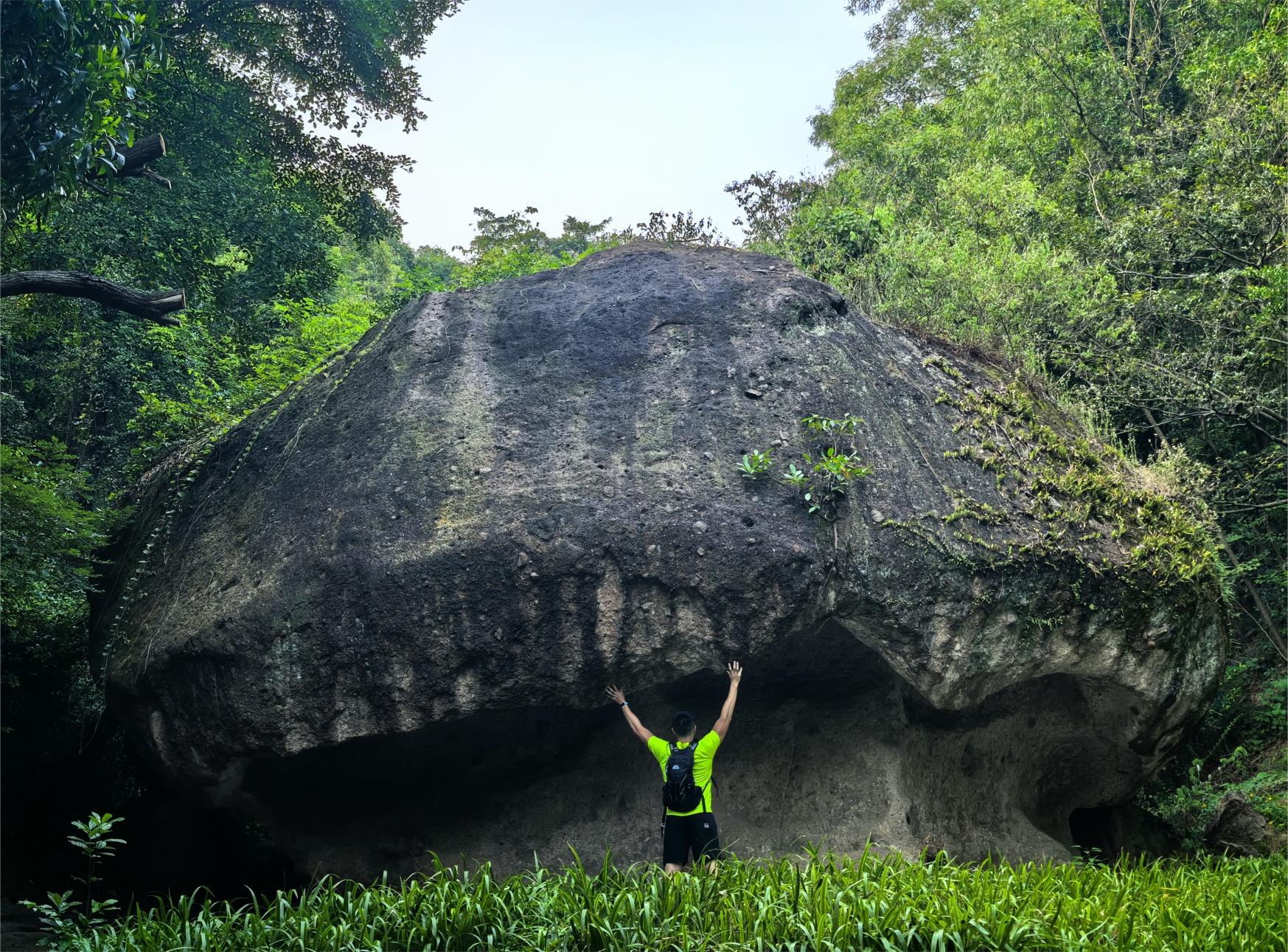 蘑菇石又名仙笠石,横列涧中,高约8尺,是从山上崩塌下来的巨大角砾凝灰岩块。其根部受长久流水冲刷侵蚀,顶部受球状风化和雨水冲刷等多种侵蚀作用,上广下锐,四檐垂下,形似冬菇,下可蔽风雨。