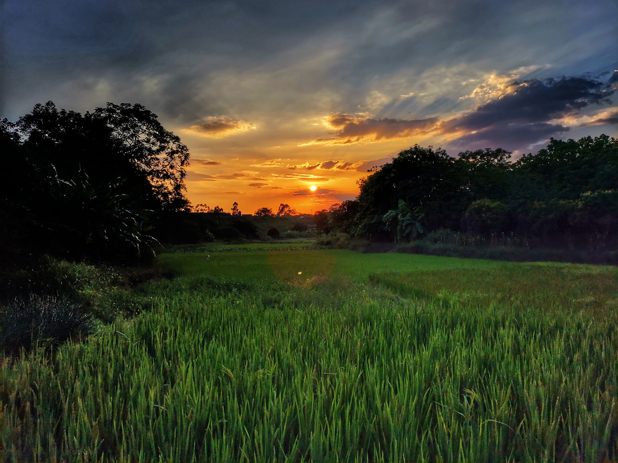 忘了是哪一次,应该是傍晚雨后夕阳,当时大人们赶回来收了晒在楼顶的稻谷,提早吃罢晚饭后都一同上到楼顶观夕阳。那个年代没有喧嚣的数码产品消遣,劳累一天之后,在夕阳傍晚下尽情舒展,无论大人还是小孩都非常惬意。