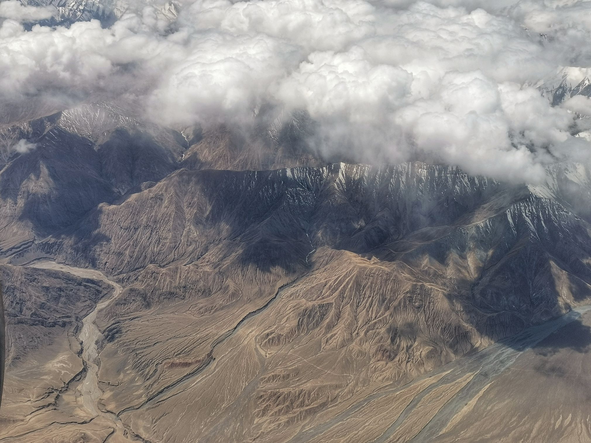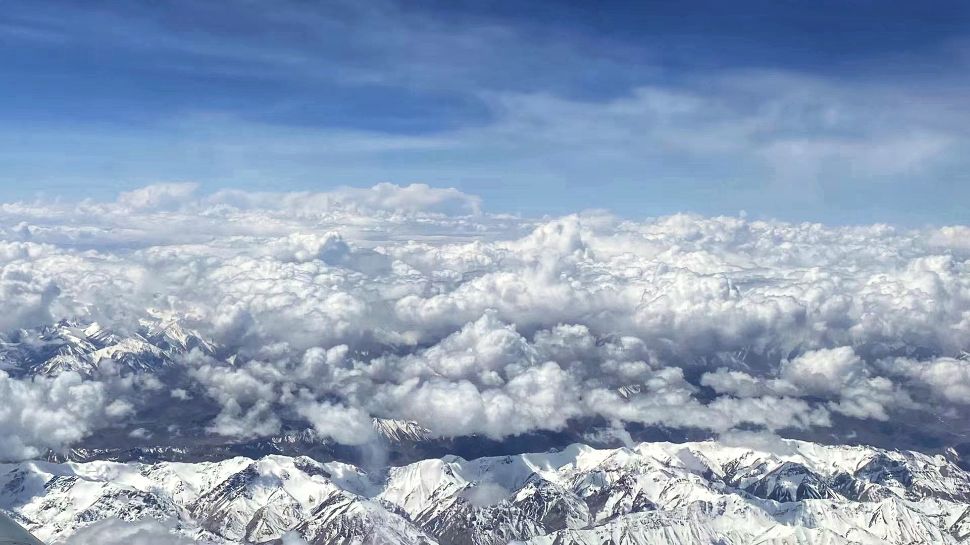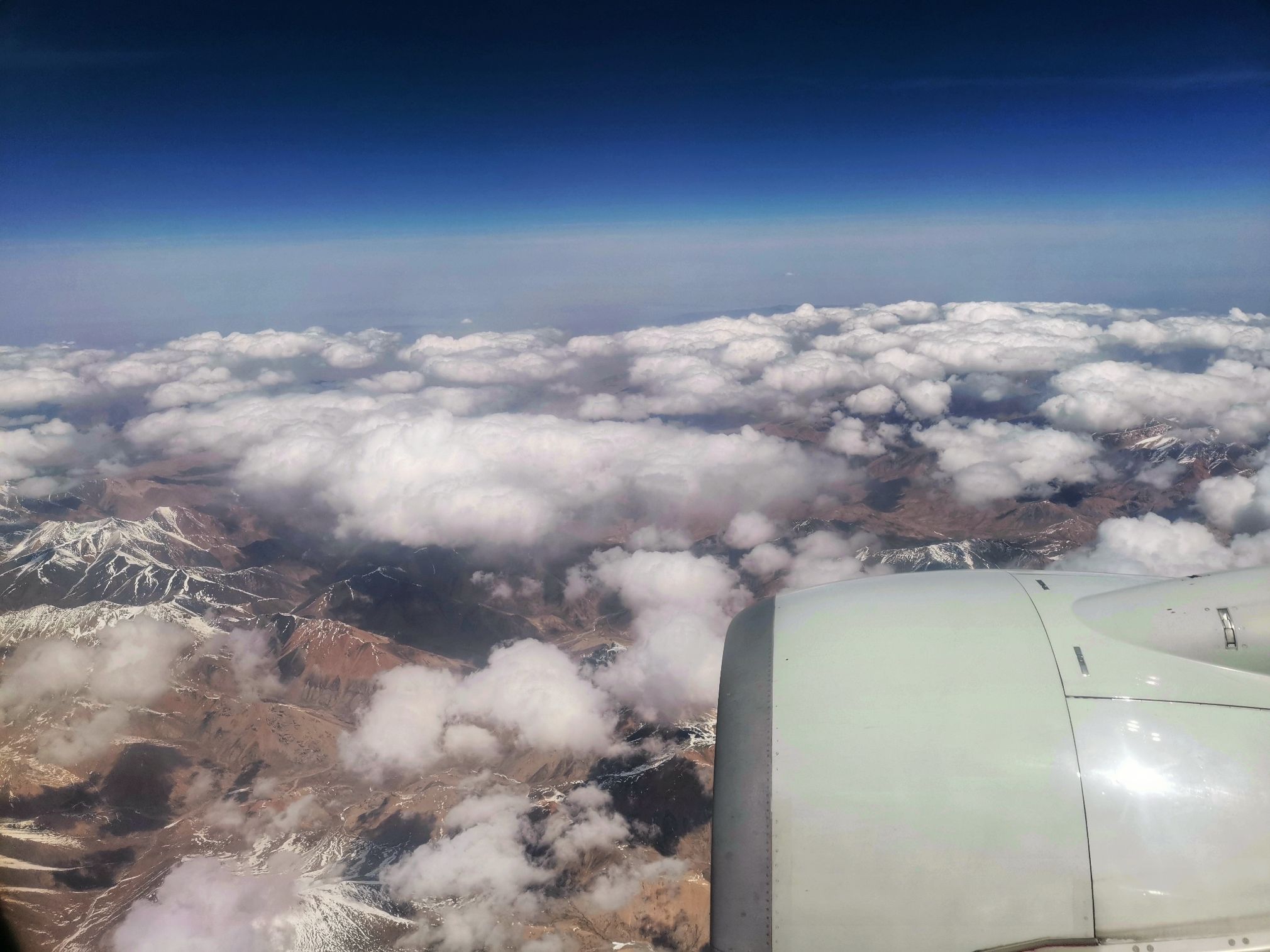 在甘肃内上空,我看到了很多壮观山脉、雪以及肉眼看起来没那么蓝,但不知为何透过飞机窗拍出来后显得极不真实的高空。