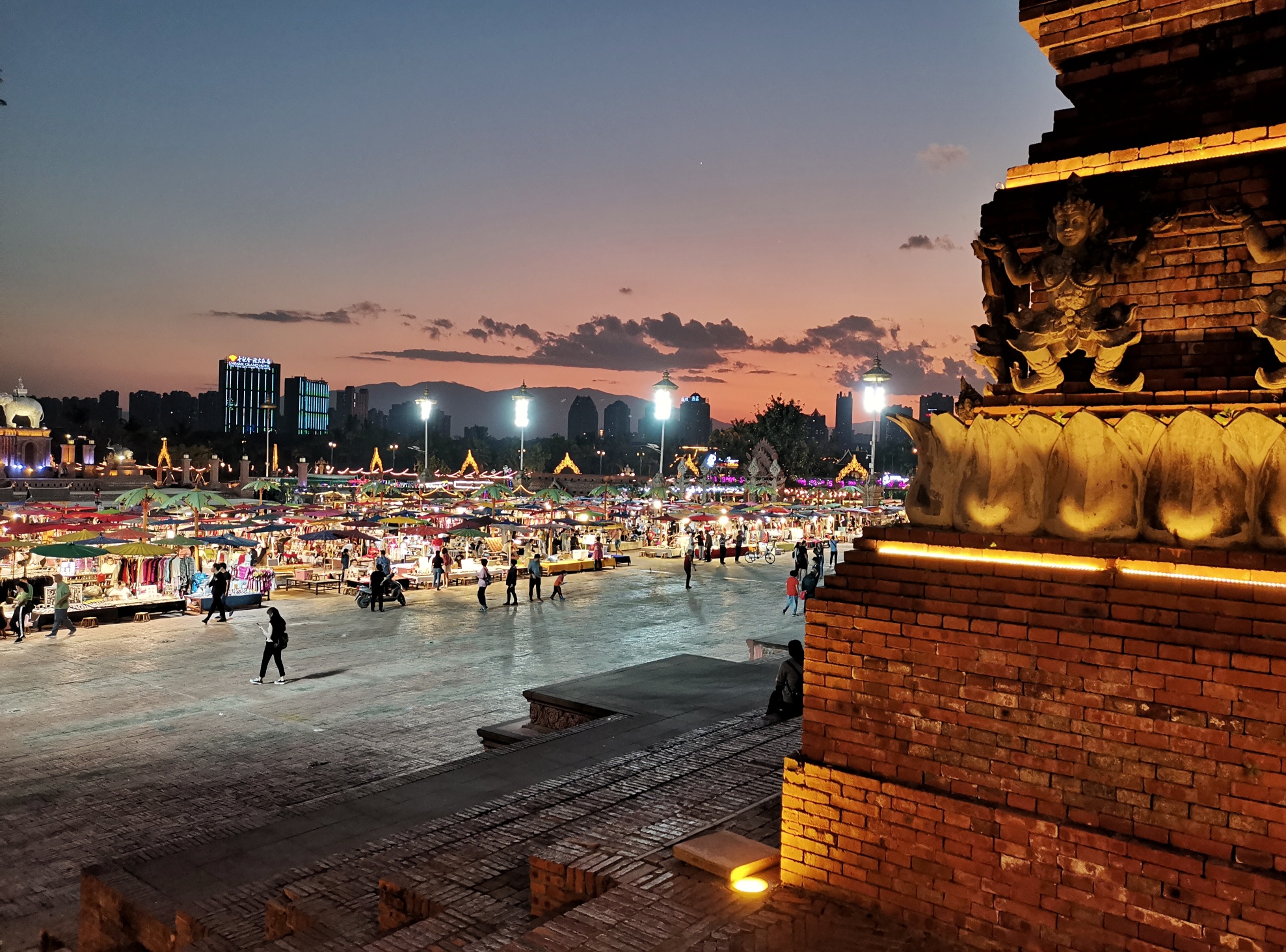 街道中心广场这新建了个高大宏伟,层次感极强的尖塔(说是新建是我看到个别角落还堆放了施工物料)老远一望很容易吸引人流,广场另一头的阶梯下去,就是江边水边的广场,组织者摆了一大片的摊档,有各色美食、手工艺品、民族服饰、好看好玩的供游客掏宝,这就是告庄夜市。