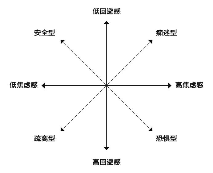 我们对两性、亲情、特别是恋爱的各种习惯思路、反应的根源,都可以追溯到童年甚至是幼年时期的家庭环境中。书本依据人们在关系中的焦虑程度与对关系的回避程度,将成年人之间的“依恋”划分为四种不同类型:安全型、痴迷型、疏离-回避型、恐惧-回避型。虽然现实中很少有人是纯粹归属于某一类,但将典型搬出来,依旧富有指导意义。